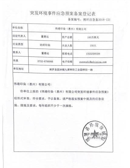 | 環(huán)境風(fēng)險評估情況 | 已制訂《偉港印染(惠州)有限公司環(huán)境風(fēng)險評估報告》,并于2024年 5月22日上報博羅縣環(huán)境保護(hù)局備案; |