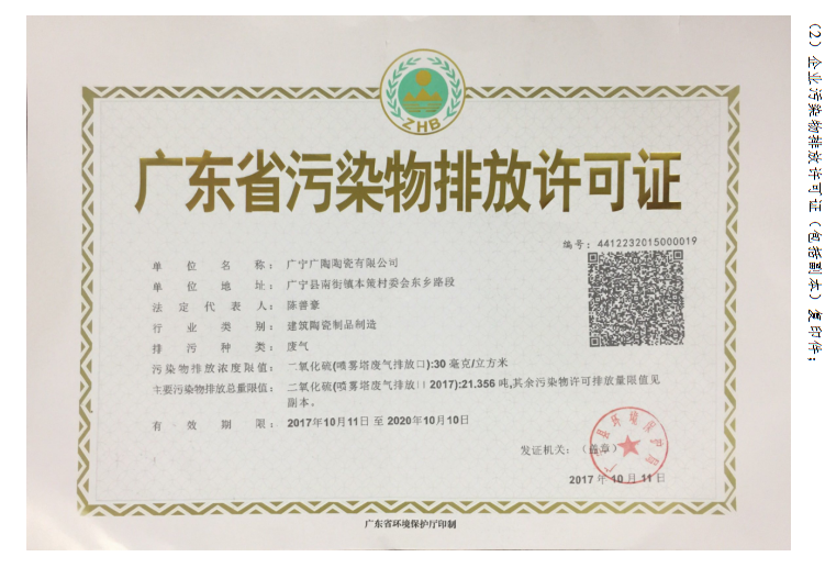 | 排污許可證(廣東省) | 附件鏈接:《廣寧廣陶陶瓷有限公司排污許可證》 | ||||||||